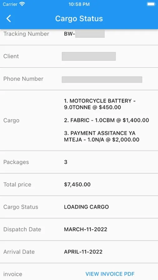 4.A user can now track his cargos using either cargo tracking number or his phone number
