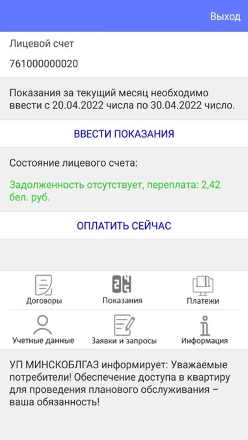 - ознакомиться с информацией о потреблении газа, платежах, текущей задолженности, по выполненным услугам и др.;