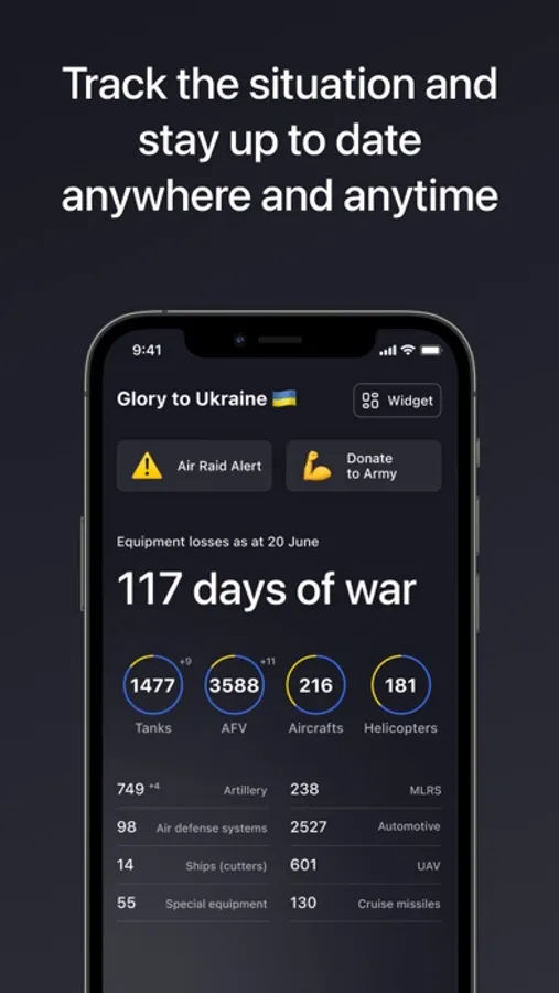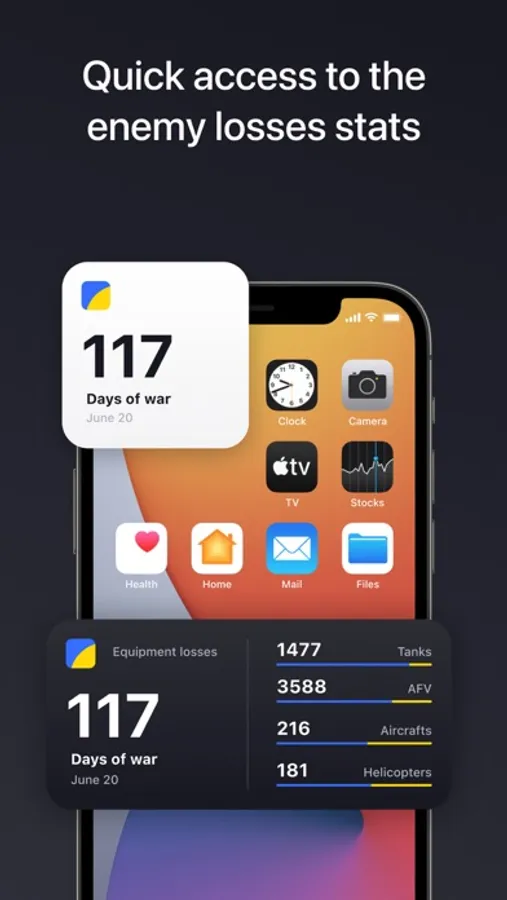 Keep track of the russian army losses with a handy widget on your home screen. Get the info about the tanks, aircraft, and other military equipment losses on one screen. The information is taken from the official website of the Ministry of Defense of Ukraine.
