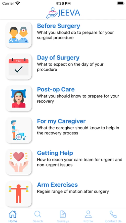 JEEVA provides patients access to content published by their healthcare providers to help quickly and intelligently find answers to their oncology recovery journey. 1 in 7 patients is readmitted within 30 days of surgery and 82% of these readmissions would have been prevented if patients had immediate access to reliable knowledge and support.