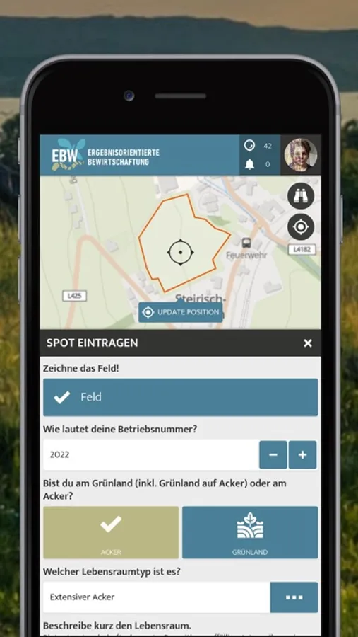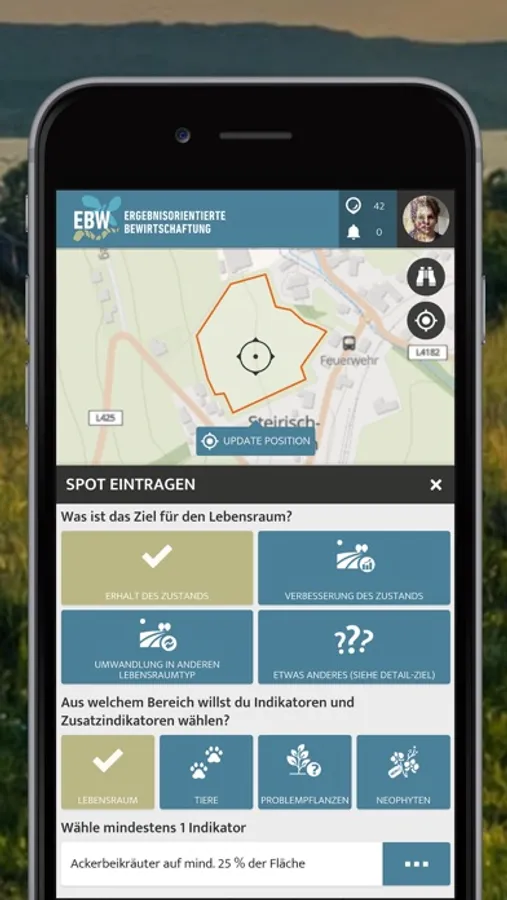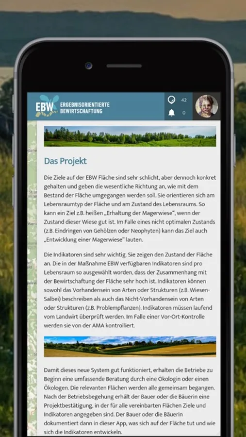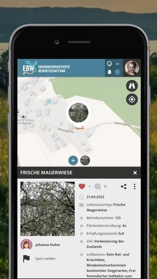 Damit dieses neue System gut funktioniert, erhalten die Betriebe zu Beginn eine umfassende Beratung durch eine Ökologin oder einen Ökologen. Die relevanten Flächen werden alle gemeinsam begangen. Nach der Betriebsbegehung erhält der Bauer oder die Bäuerin eine Projektbestätigung, in der für alle vereinbarten Flächen Ziele und Indikatoren angegeben sind. Der Bauer oder die Bäuerin dokumentiert dann in dieser App, was sich auf der Fläche tut und wie sich die Indikatoren entwickeln.