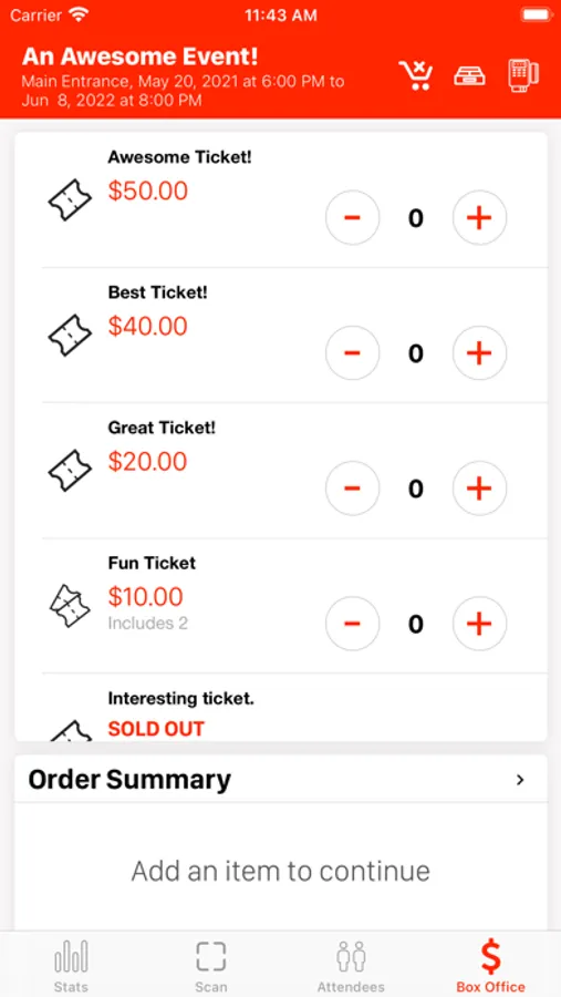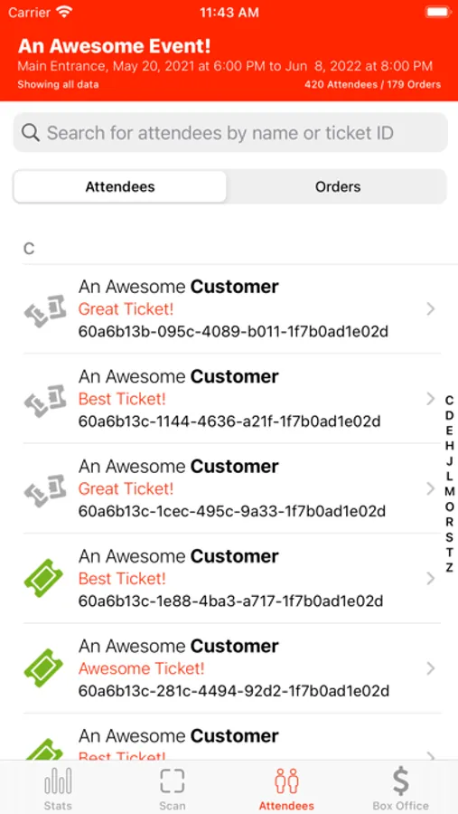 - Easily find attendees through search of last name, ticket number, or order confirmation number