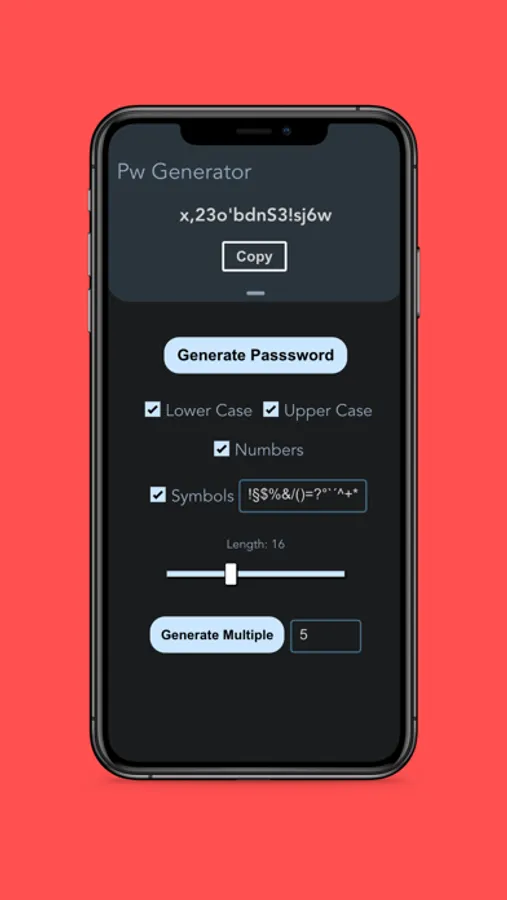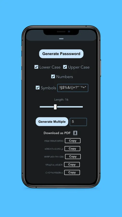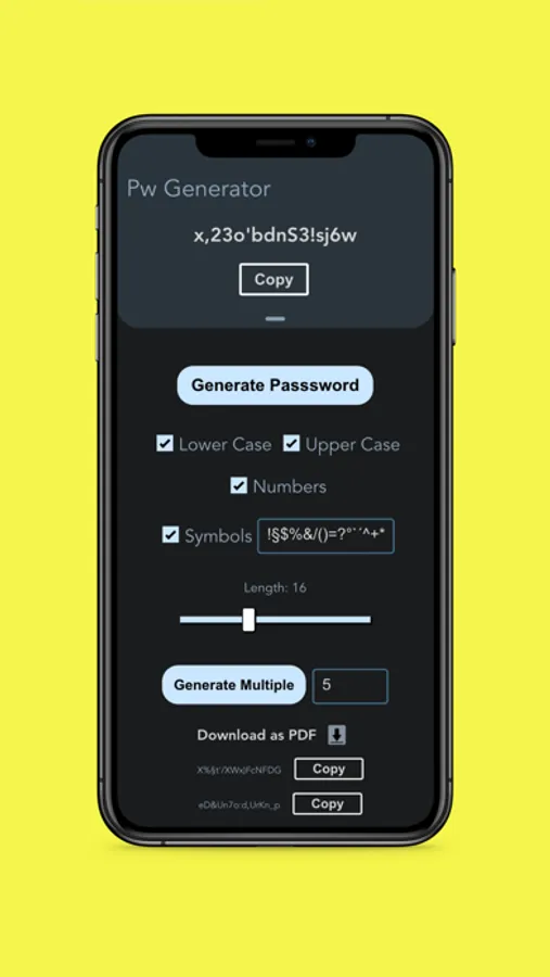 Easily generate secure passwords by setting the length and the available symbols of the passwords.