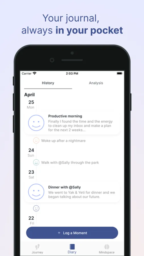 • identify your emotions with our smart emotion picker and find productive ways to deal with them