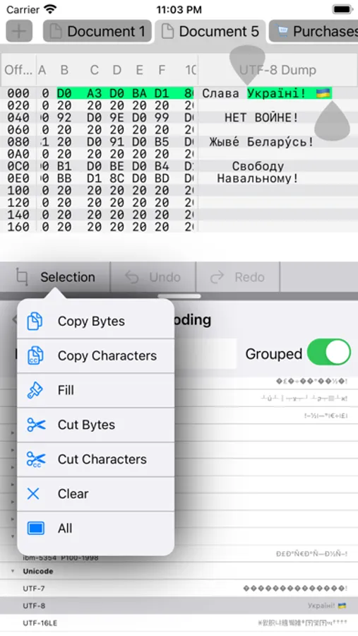 • Quick view of selected bytes/characters directly in the encoding selection table