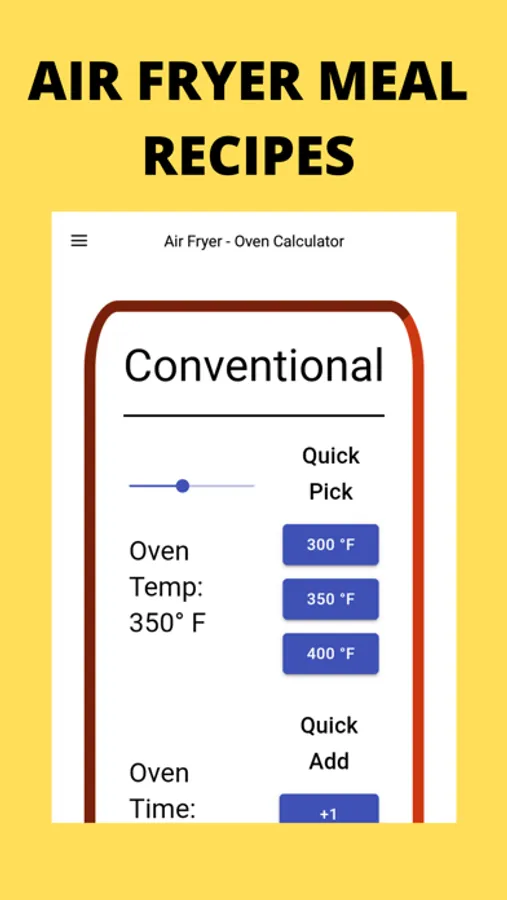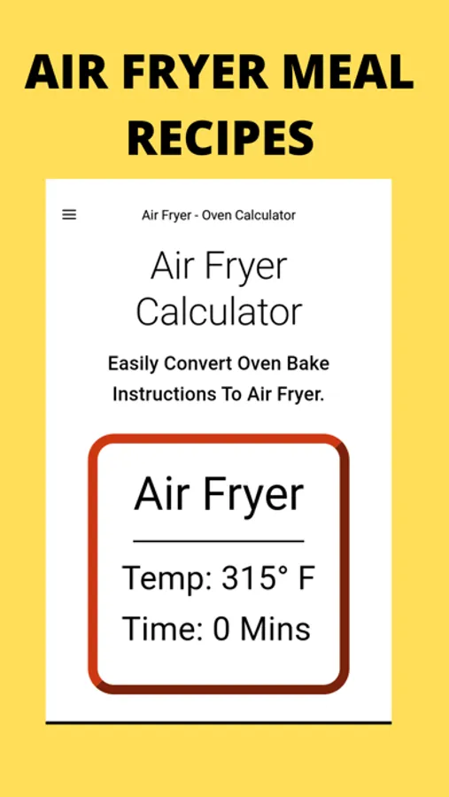 Simple calculator that converts Conventional Oven temp & time to Air Fryer temp & time.