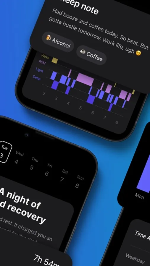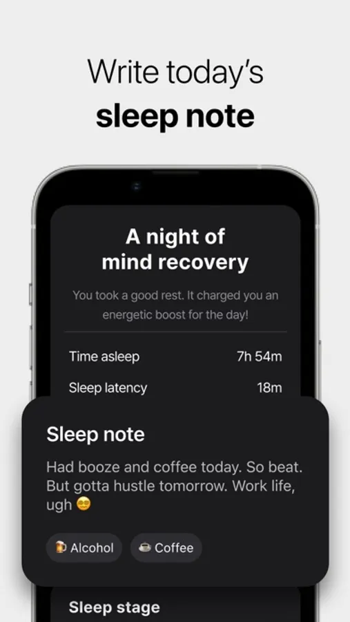Sleep app with accurate sleep measurement, AI alarms at optimal sleep stages, easily interpreted reports, fantastic dream images, and a daily note for routines.