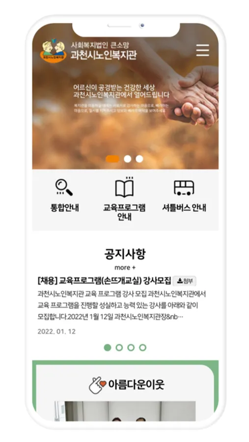 '우리동네에서 행복한 어르신'을 꿈꾸는 과천시노인복지관입니다.