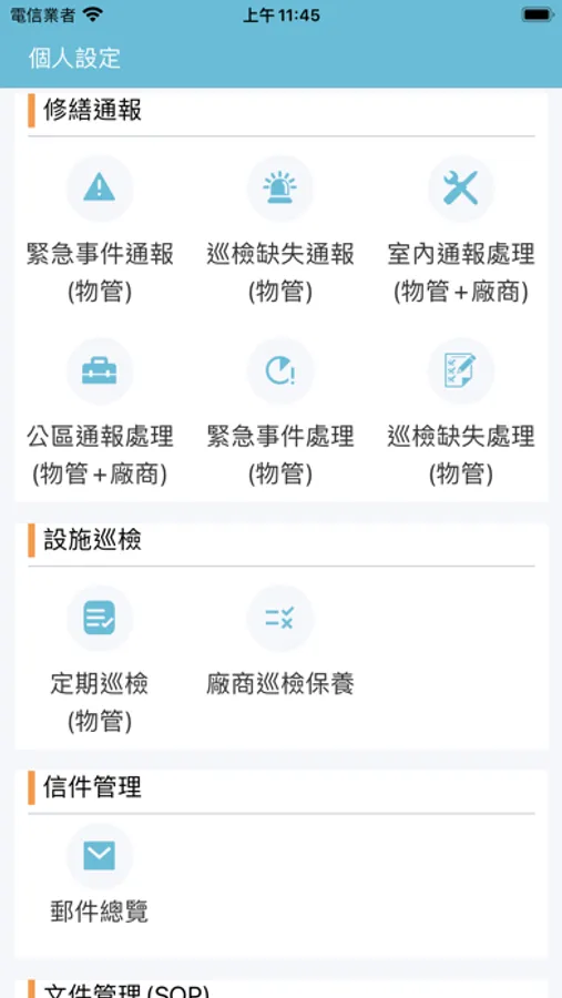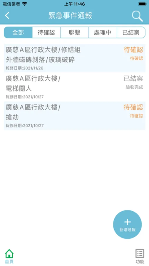 1.修繕通報:室內修繕通報,緊急事件通報,公區修繕通報,巡檢缺失通報,室內通報處理,緊急事件處理,公區通報處理,巡檢缺失處理