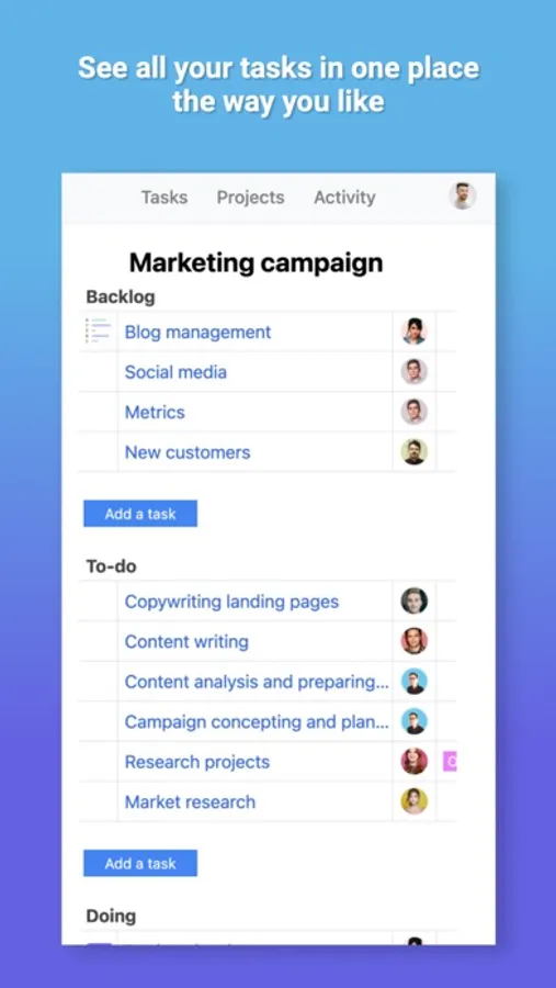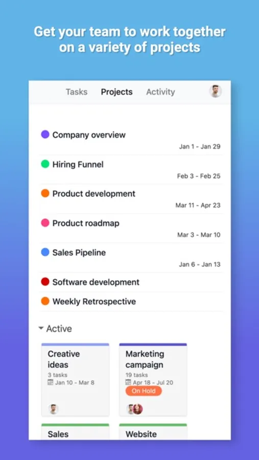 Break your team’s work down into manageable tasks and give each one a clear owner. See all your work in task lists, project boards, or a calendars.
