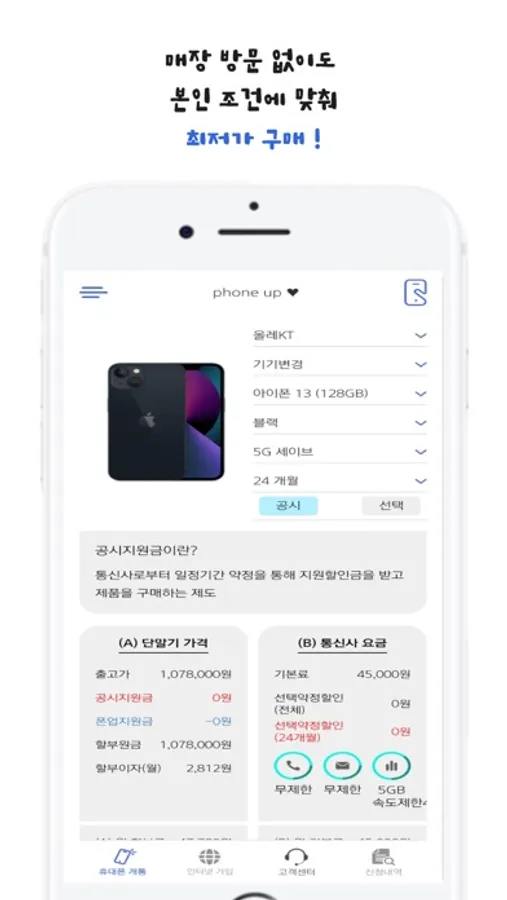 원하는 핸드폰의 최저가 가격을 안내 받고 구매를 진행 할 수 있습니다