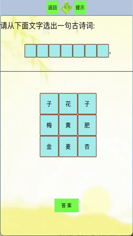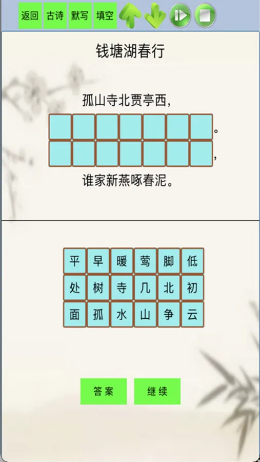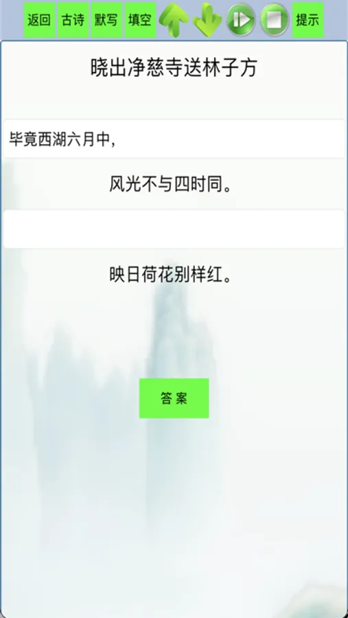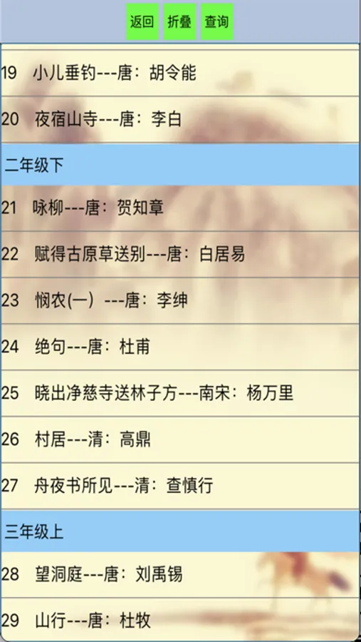 本软件旨在帮助中小学生更加轻松的背诵古诗和文言文。软件分为小学,初中和高中三部分。