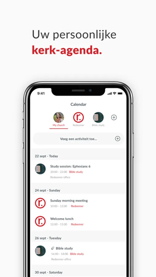 View the calendar for your entire community, but also for specific groups. Thanks to the smart group structure, each user has his own unique church calendar. Then link it to your own personal calendar and don't miss a thing!
