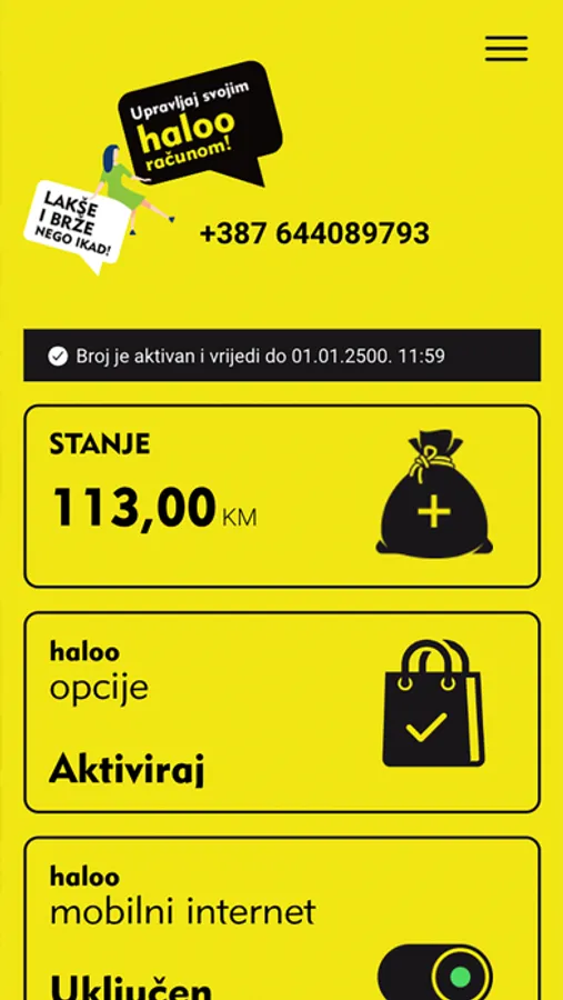• pregled trenutnog stanja i vremenskog trajanja haloo računa,