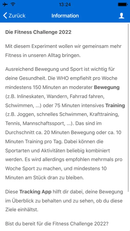Das ist die App zur Fitness Challenge 2022! Mit diesem Experiment wollen wir gemeinsam mehr Fitness und Bewegung in unseren Alltag bringen. Du kannst in der App deine Bewegungs- und Trainingszeiten eintragen, digitale Abzeichen gewinnen und deine Leistung im Wochenranking mit anderen Nutzern vergleichen.