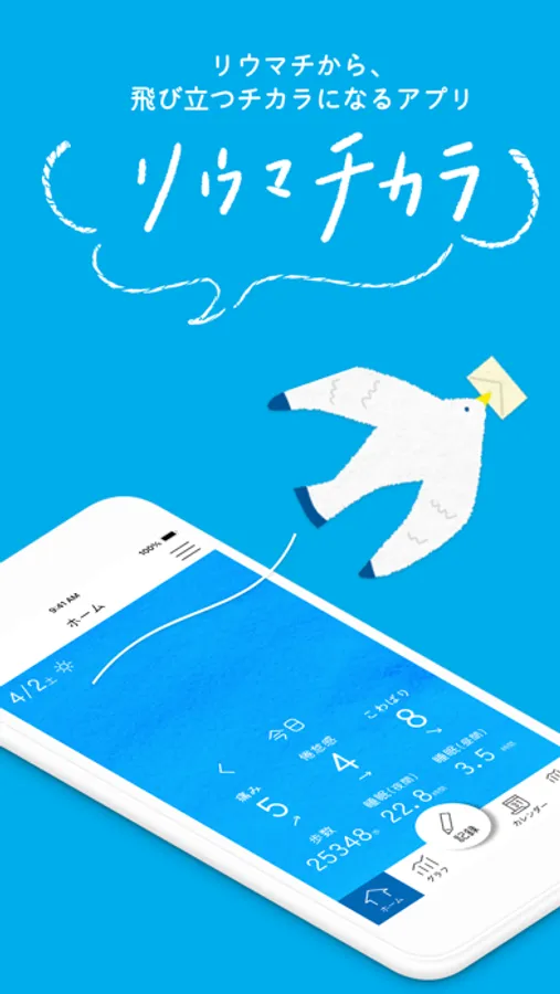 「リウマチカラ」は関節リウマチ患者さんの痛みなどの症状、服薬状況、睡眠や歩行などの活動データを統合的に「みえる化」し、そのデータを、医師をはじめとした医療者やご家族にも「みえる化」することで、よりよい暮らしを目指すことを支援する「リウマチみえる化アプリ」です。
