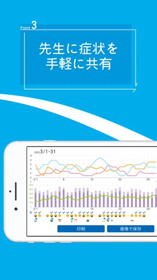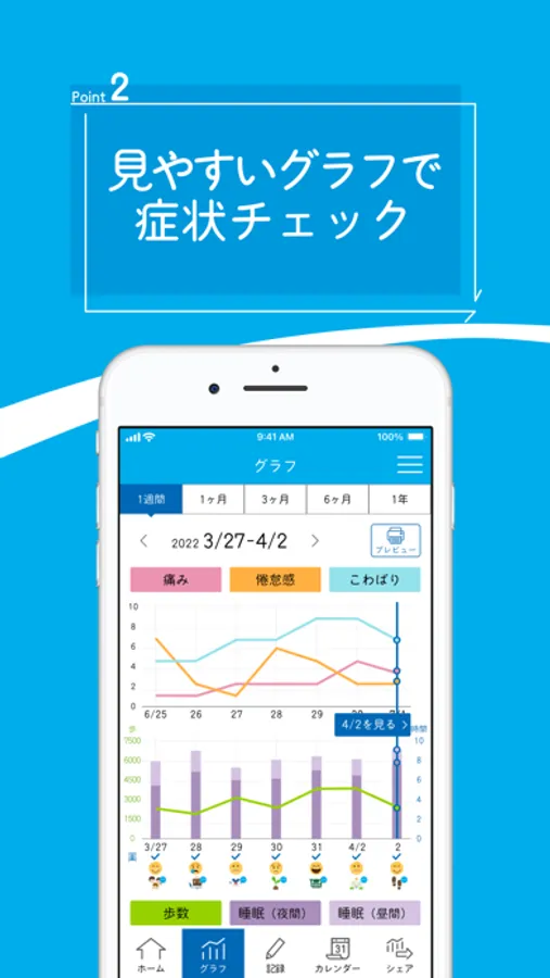 どのようなときに症状が出るのかグラフとカレンダーで振り返ることができ、症状を客観的にチェックできます。服薬記録や日々の予定、気分も記録可能です。