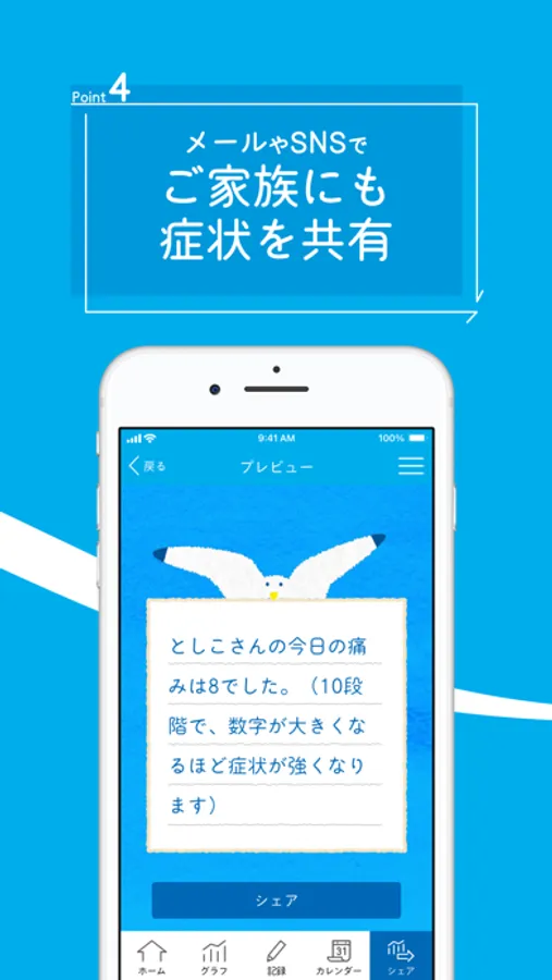 ご家族やパートナー、ご友人にも伝えづらかった症状をわかりやすく伝えることができ、適切なサポートを相談しやすくなります。また、共有したい内容だけを選ぶことも可能で、LINEやメールなど普段の会話の中で気軽に伝えることができます。
