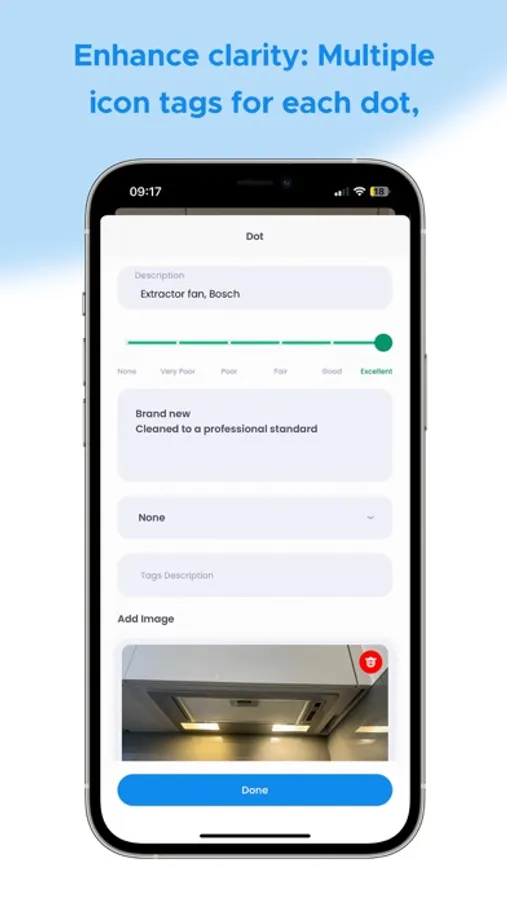 2. Add annotated Dots to areas of concern or describe an item: Highlight areas of concern and provide detailed descriptions by adding annotated Dots directly onto the app.