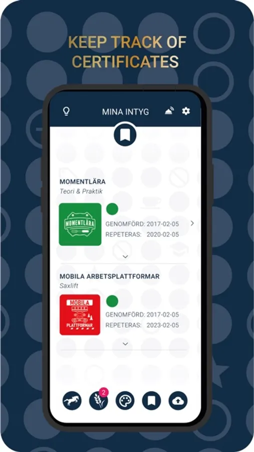 Här finns alla dina lagrade intyg. Symbolerna och signalfärgerna avslöjar tex om intyget är giltigt eller ska repeteras i närtid. Har du intyg som inte finns med i listan? Gå till LADDA UPP och skicka in till oss för registrering.