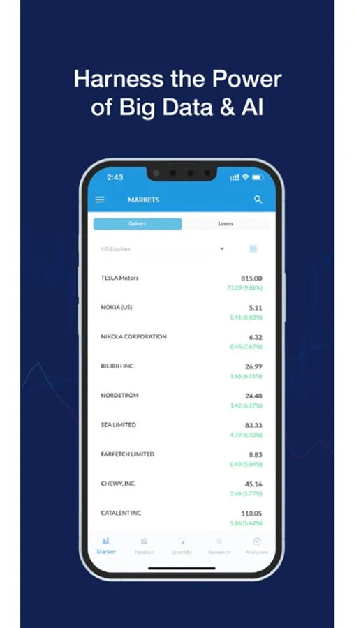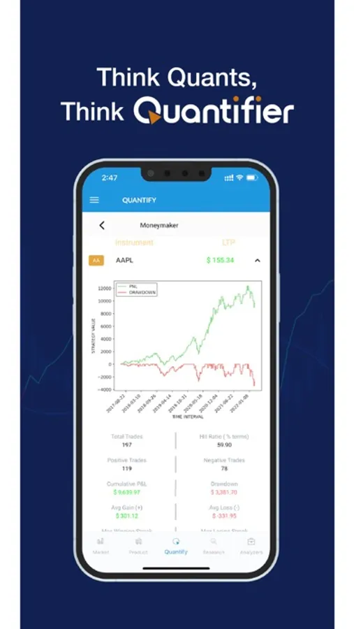 Quantifier is a strategic trading app that combines the best of human intelligence and machine learning to boost stock market returns by combining enormous financial big data research with machine learning based on back tested trading techniques. To keep things simple, we have used the US Navy's famous KISS (Keep It Simple, Silly) approach to platform development. Quantifier will change the way investors research, analyze, and monitor markets. We reduce the time to evaluate and identify opportunities for you. With our platform, you can easily create test & automate trading scenarios without learning technical coding. You can analyze and understand the strategy by viewing the performance statistics in a more user-friendly manner. Quantifier keeps track of real-time market data, technical indicators & macroeconomics on a 24/5 basis. Make use of the platform's customized risk /reward setup to find out the best-fit parameters. Analyze and execute the strategies as per the current market condition and individual risk appetite. Our platform provides you with a wide variety of live strategy examples to get you started smoothly & in no time. The platform would offer more trading opportunities with its 60 + technical indicators defined at the lowest level of signal generation on 240 + products. You can analyze the performance of a strategy as simple as one that keeps on buying for every higher daily market close price. Users can explore their most traded products with our platform to balance out any inefficiencies and look for the best indicators. Availability of multiple time frames OHLC data will allow the user to backtest strategy across numerous durations. Some of our exciting and upcoming features will include the availability of demo funds & market look-through analyzers for better understanding. True to our tagline, whenever you Think Quants, Think Quantifier.