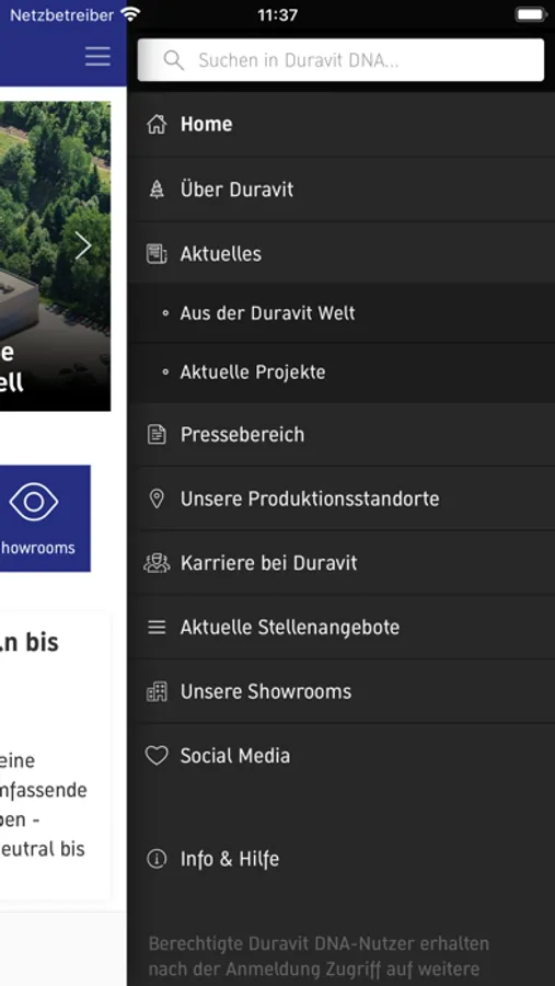 Die DNA als zentrale Kommunikations-App der Duravit Gruppe bietet allgemeine Informationen zum Unternehmen wie eine Übersicht über unsere Standorte und Showrooms weltweit. Zudem erfahren Sie alles über Duravit als Arbeitgeber und aktuelle Karrieremöglichkeiten. Darüber hinaus bieten der Pressebereich und aktuelle Social Media Feeds die aktuellsten News. Für registrierte Nutzer stehen weitere Inhalte und Funktionen zur Verfügung.