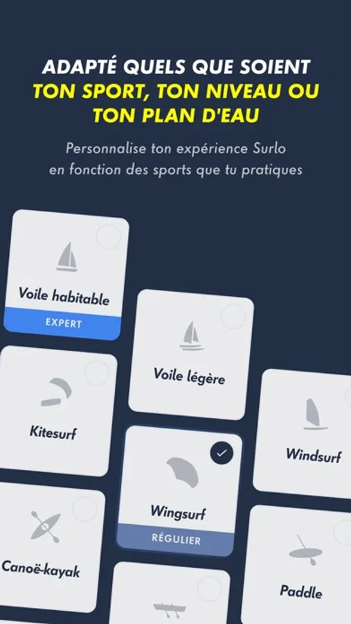 Surlo couvre tous les sports nautiques (voile, voile légère, kite, planche à voile, wing, canoë-kayak, aviron, stand-up paddle etc.) et s’adresse à tous les pratiquants, quels que soient leur niveau (occasionnel, régulier, expert, pro) ou leur plan d’eau (mer, lac, rivières).