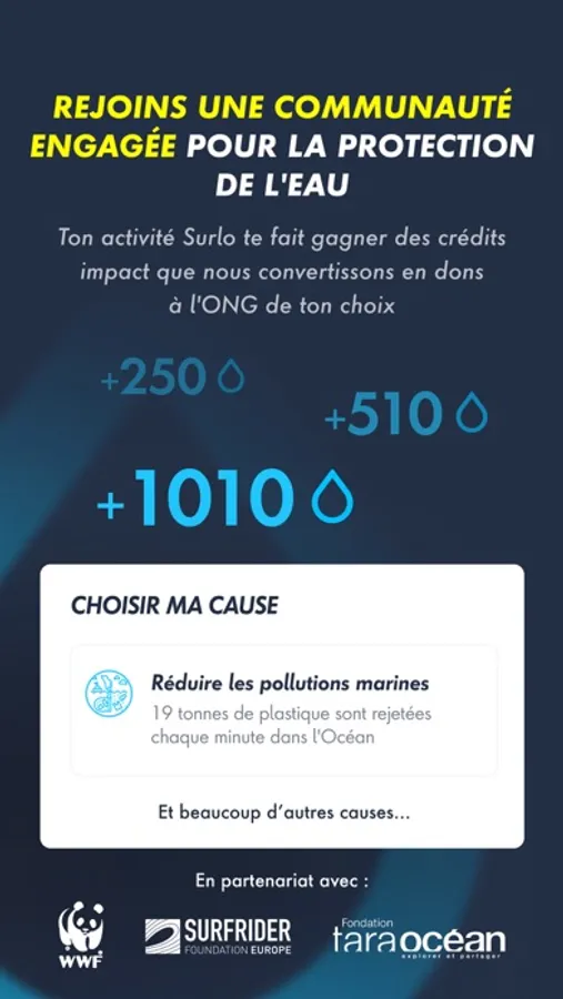 Surlo, c’est également une communauté engagée pour la protection des Océans. Au travers de ton activité Surlo, tu gagnes des « crédits impact » qui sont convertis en soutiens financiers à l’ONG de ton choix: WWF France et son programme « Méditerranée », Surfrider Foundation Europe, Tara Océan etc.