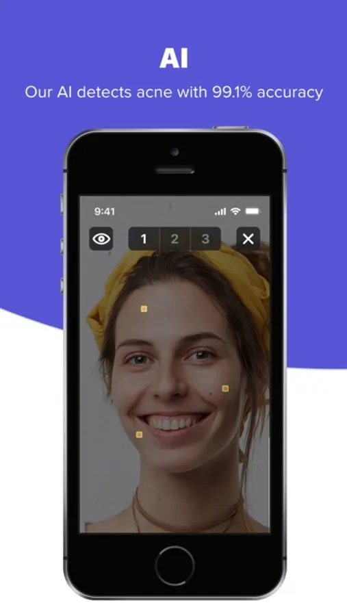 Take a photo of your face and our artificial intelligence will find acne and show the percentage of the affected area of each zone: forehead, temples, T-zone, nose, cheeks and chin. Any micro change that is difficult to notice even with the closest eye will not pass by the attention of our skincare AI. You will always have an objective picture of the changes. Our AI detects acne with 99.1% accuracy.