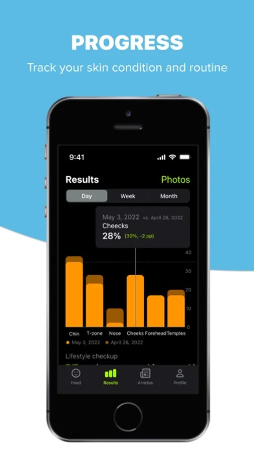 In the Results section, we will show you daily, weekly and monthly progress, highlighting what you should pay attention to and what actions to take to improve your skin, to get rid of acne and make your skin cleaner.
