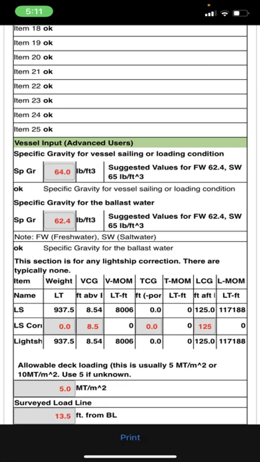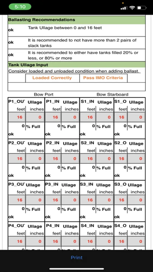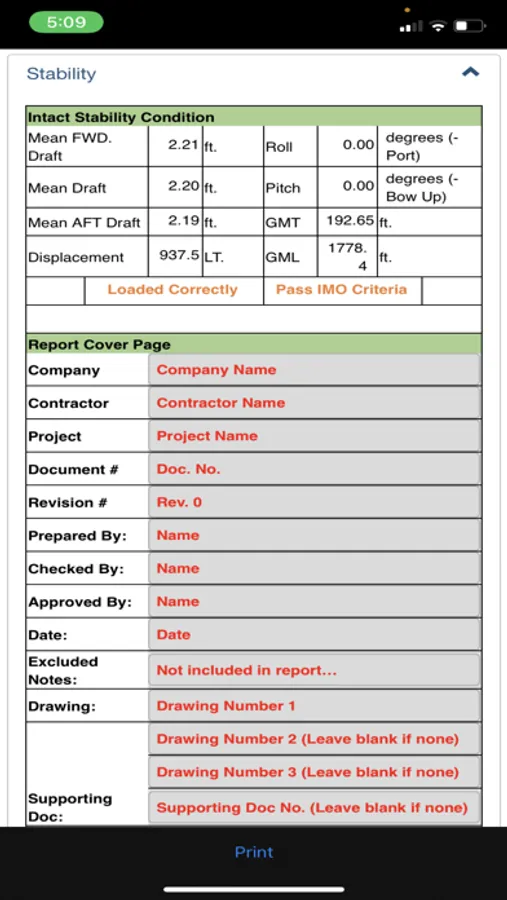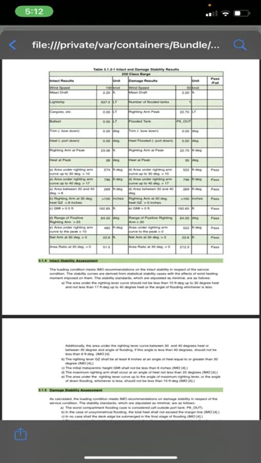 The report format has been approved by all the major oil companies, IMO, and DNV. Calculations are based on hydrostatic tables approved by ABS. Calculations use IMO and DNV methods to produce results for the report. The app was developed and crossed checked with a model built and ran in MOSES. Model was previously approved by IMO and DNV.