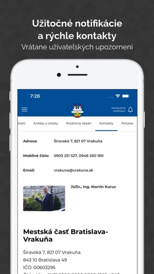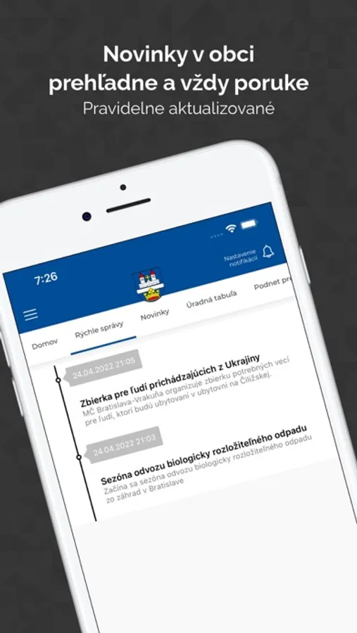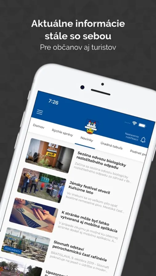 Mobilná aplikácia mestskej časti Vrakuňa. V aplikácii nájdete aktuálne informácie z diania v obci, kalendár, dôležité kontakty aj top lokality. Môžete si nastaviť upozornenia na rôzne udalosti, od noviniek, cez udalosti kalendára až po denné sumáre. Obec Vám v prípade kritickej situácie (napr. povodne) môže poslať upozornenie priamo do aplikácie.