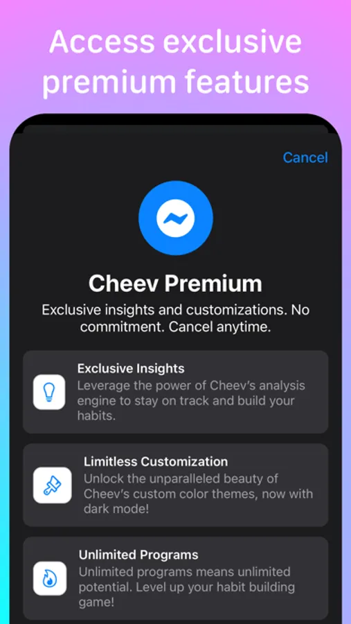 - Highly Adaptable Plans for Real Life: Your life is unique, and your habit-building plan should be as well. Cheev offers highly customizable programs that can be adjusted to your needs and preferences, whether you want rapid changes or a gradual transformation.