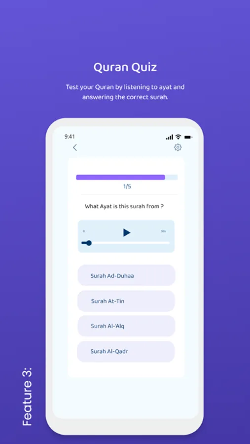 You will be provided with questions about the pillars of Islam, the Prophet and his companions, Hajj (pilgrimage to Mecca), fasting in Ramadan, and much more about Islam for you to answer. This also includes Quran audio verse where you must answer the name (Surah) of the audio verse.