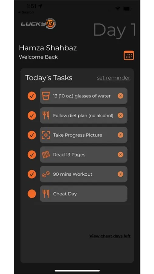 The Lucky 13 program has been designed to help you change your season. Whether you're looking to use this as a way to change physically, mentally, or both, over the next 90 days you will be changing your lifestyle habits to better yourself. Designed to start at any time, this app will help you: track your daily progress, set custom reminders for your daily tasks, take and review your daily progress picture, and share your progress with your friends or on social media.