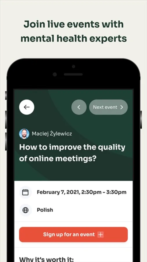 + Unlimited access to a mental health and well-being resource library (interactive events, mindfulness exercises, relaxation training, psychoeducational courses),