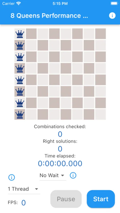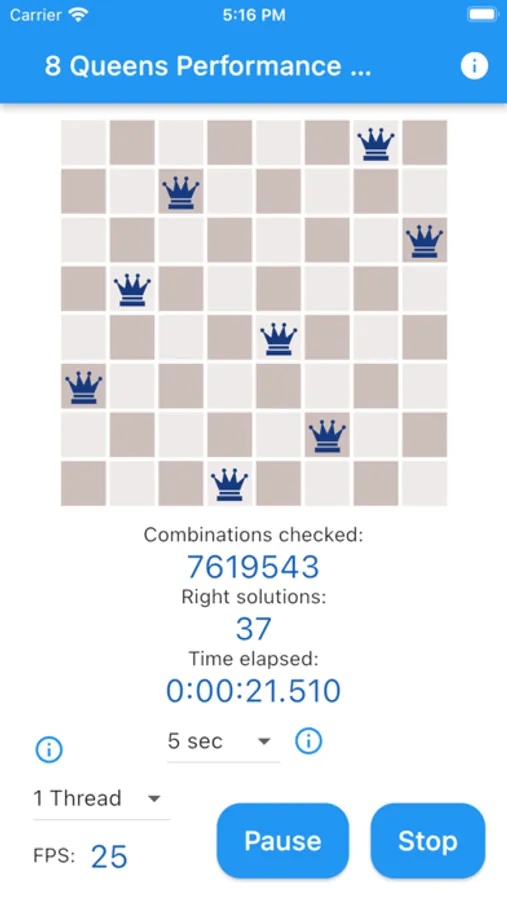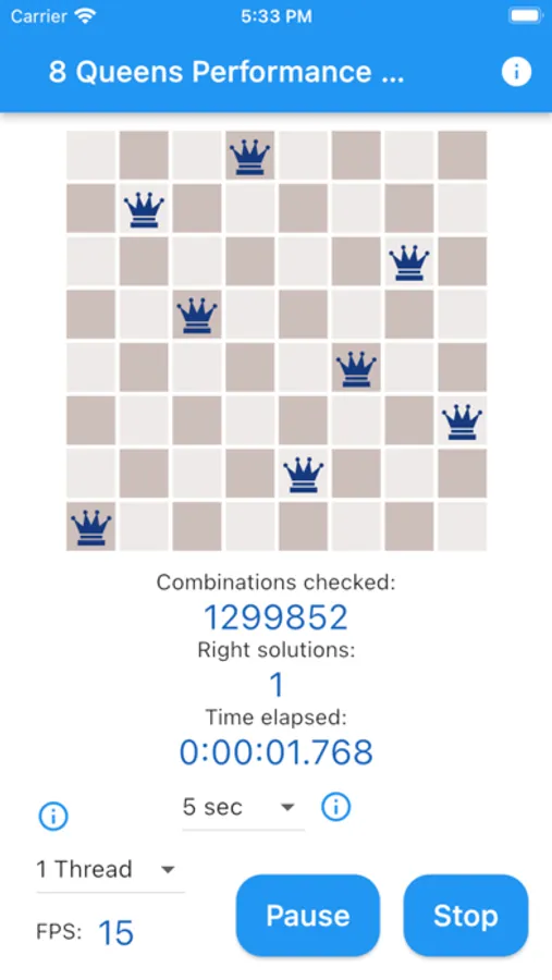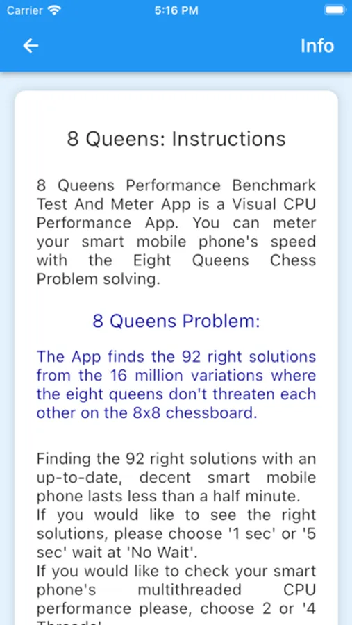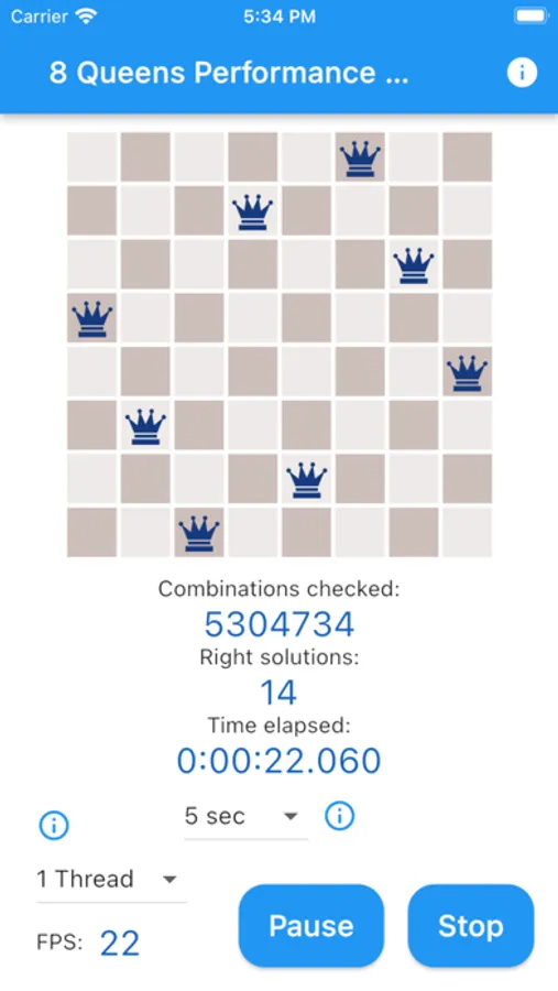 Eight Queens Performance Benchmark Test And Meter App is a Visual CPU Performance App. You can meter your smart mobile phone's speed with the Eight Queens Chess Problem solving. The App finds the 92 solutions from the 16 million variations where the eight queens don't attack each other on the 8x8 chess board. Finding the 92 right solutions with an up-to-date decent smart mobile phone lasts less than a half minute.