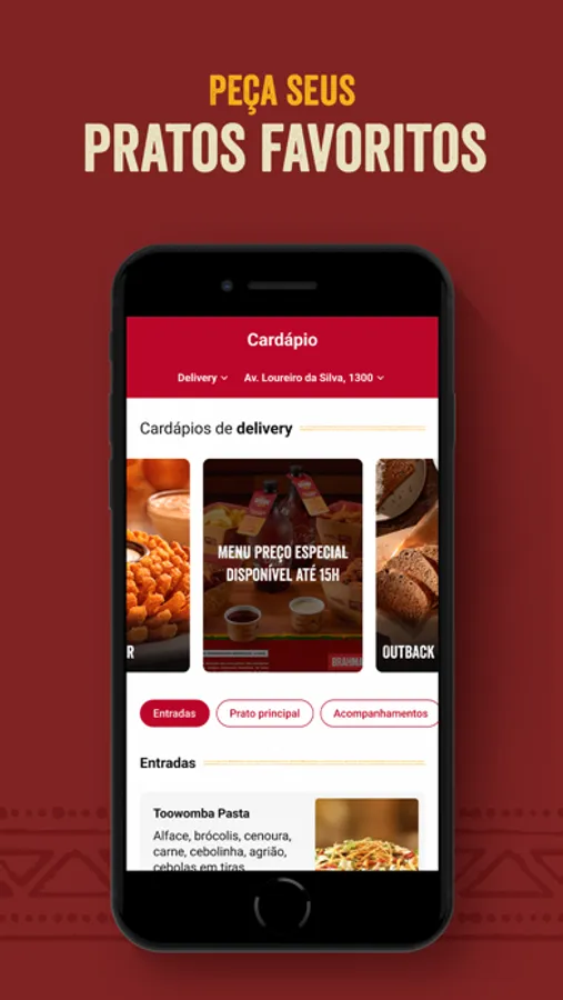 Além do delivery e de comer no restaurante, você também pode pedir pelo app e retirar no Outback escolhido para comer em outro local.