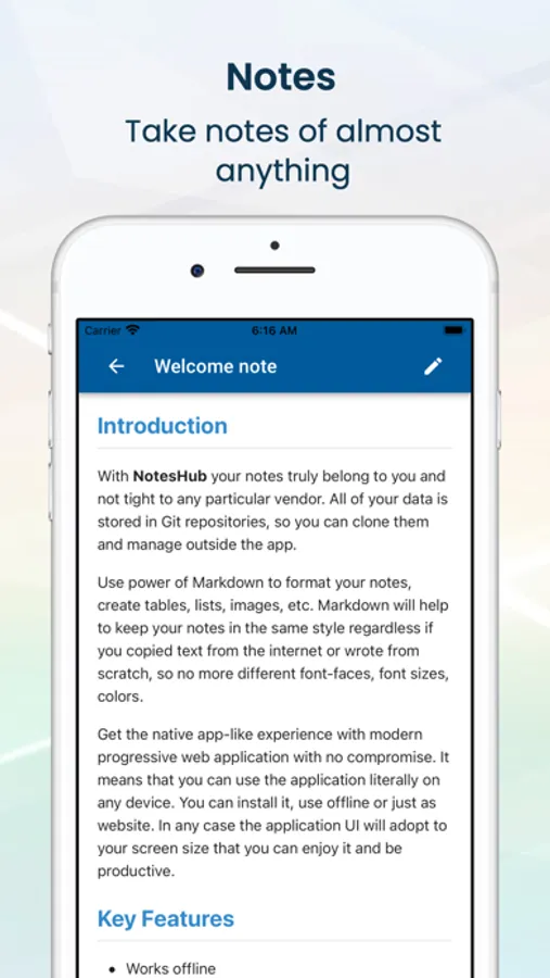 With NotesHub your notes truly belong to you and are not tight to any particular vendor. All of your data is stored in Git repositories, so you can clone and manage it outside the app.