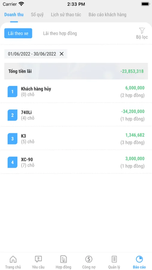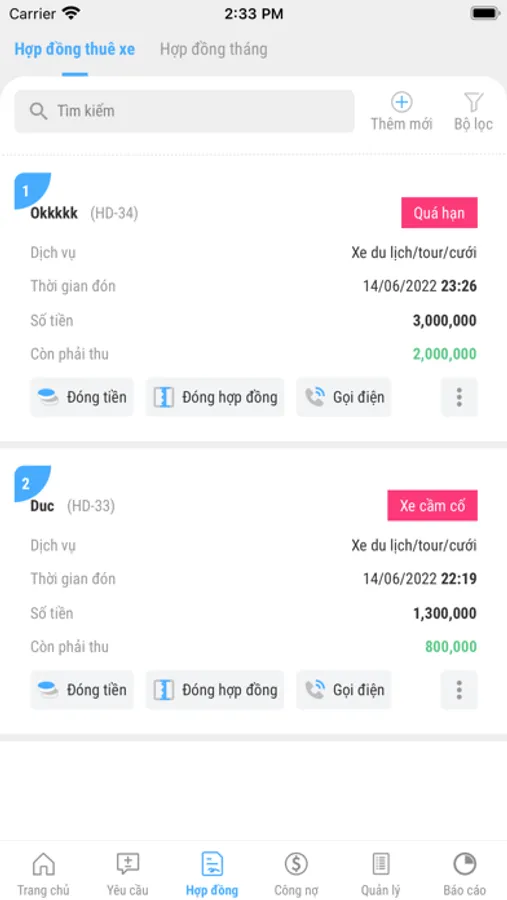 Hợp đồng được quản lý và phân loại theo trạng thái hợp đồng: Chờ xe chạy, đang chạy, quá hạn...