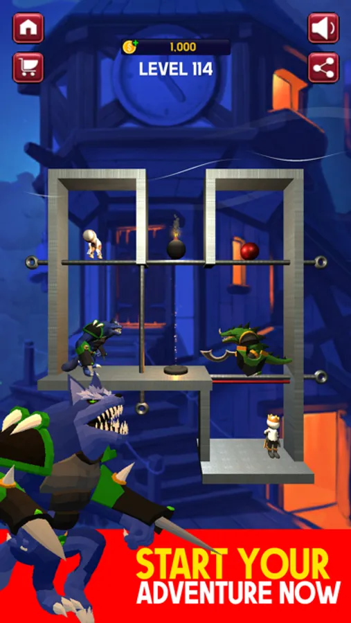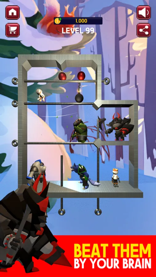 - Pull pins to escape! Use your mindset to pull the pin to destroy the monster then come next to the queen and treasure.