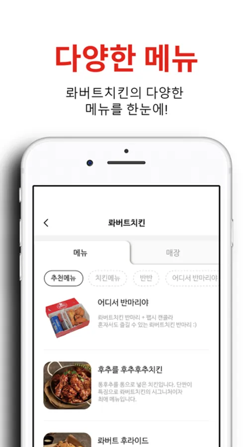 어디에서도 맛볼 수 없는 롸버트치킨만의 다양한 메뉴를 즐겨보세요!
