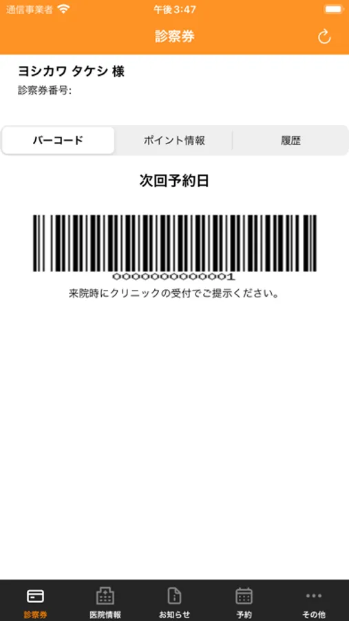 バーコードをかざすだけで受付出来るチェックイン機能、次回ご予約日時表示など、カードレスな診察券としてご活用頂けます。