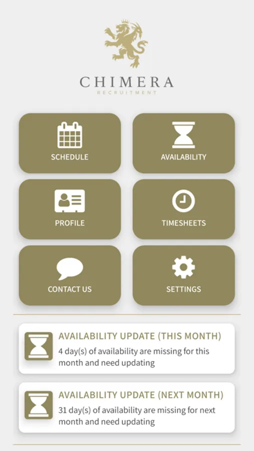 The Chimera Recruitment Portal app allows team members to review their shifts, submit timesheets, update personal details and let us know their availability. It is intended for existing team members and requires a user id and password to access it.