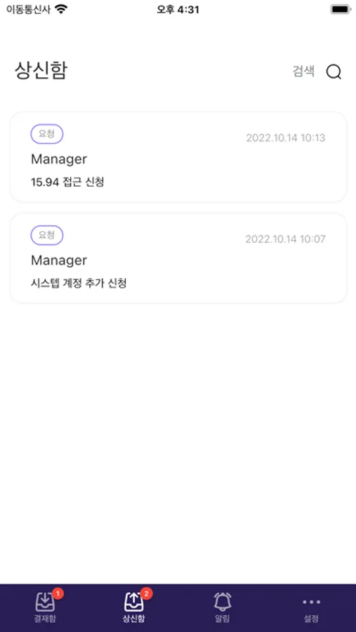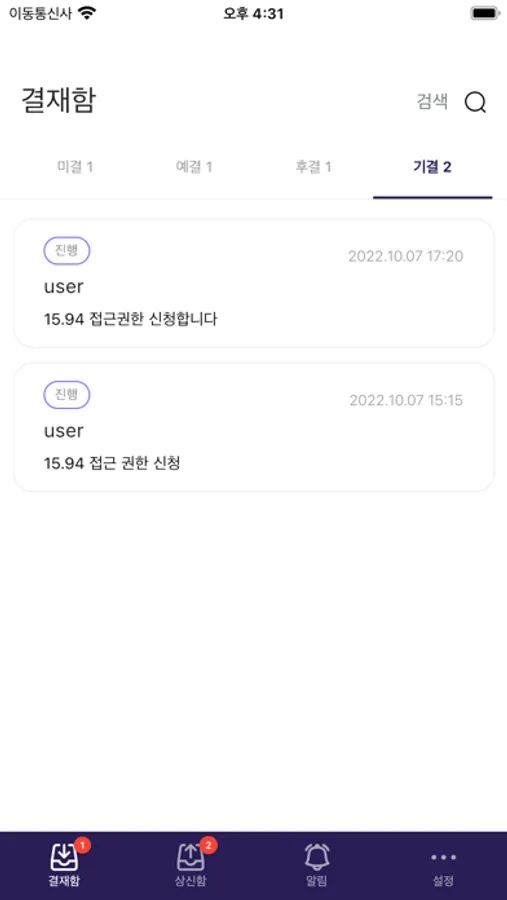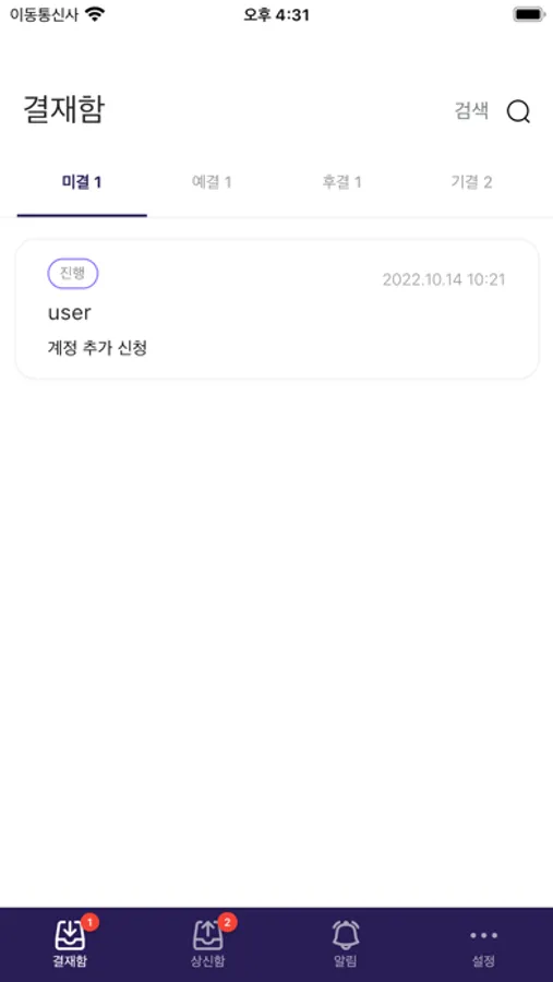 미결(결제 필요 내역), 예결(결제 예정 내역), 후결(사후 결제 내역), 기결(결제 완료 내역) 등을 확인 할 수 있으며,