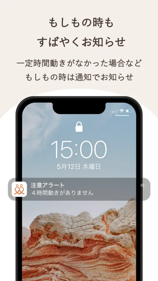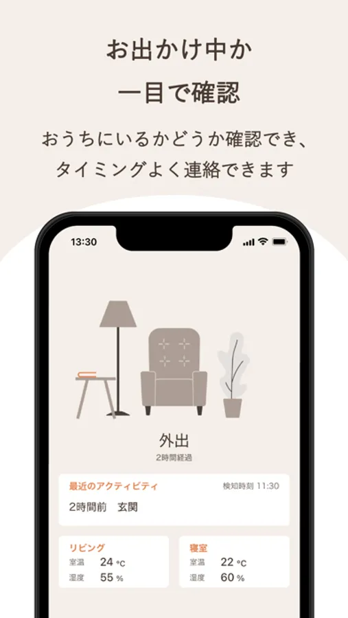 一定時間、室内で動きがなかった場合や、室内の温度・湿度が熱中症の危険性がある時に通知でお知らせします。