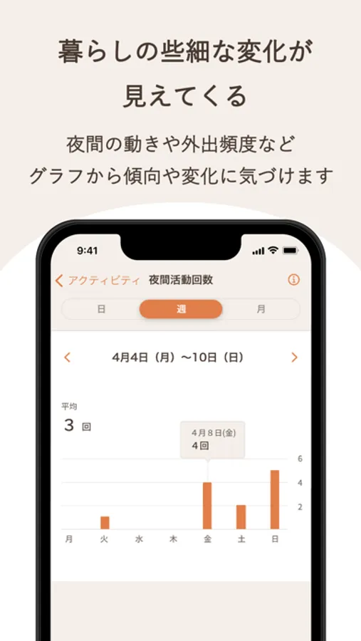 活動開始時刻、夜間の活動回数、お出かけ回数など、日/月/週の活動のグラフから、暮らしの些細な変化や傾向に気づくきっかけになります。