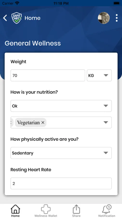 - General Wellness - SafeCheck monitors several basic wellness attributes, including weight, heart rate, blood pressure, nutrition tracking, activity levels, and other key wellness indicators. It also monitors key elements such as glucose levels, cholesterol and blood oxygen volume and saturation for individuals with chronic conditions. Reports tracking this information over time is added to the medical records and can be shared or secured with the Wellness Wallet.
