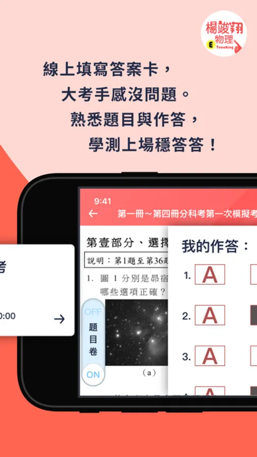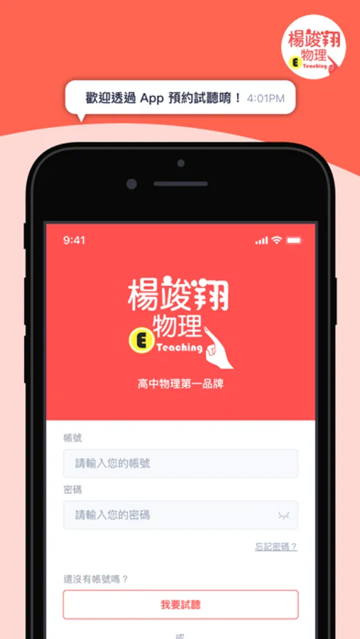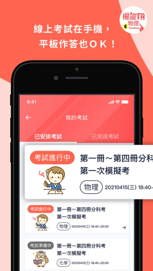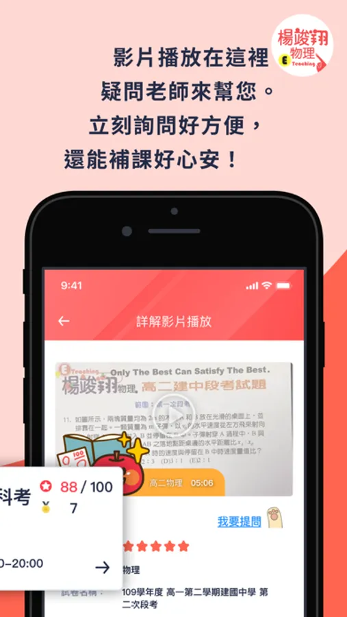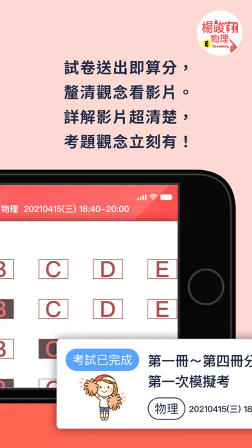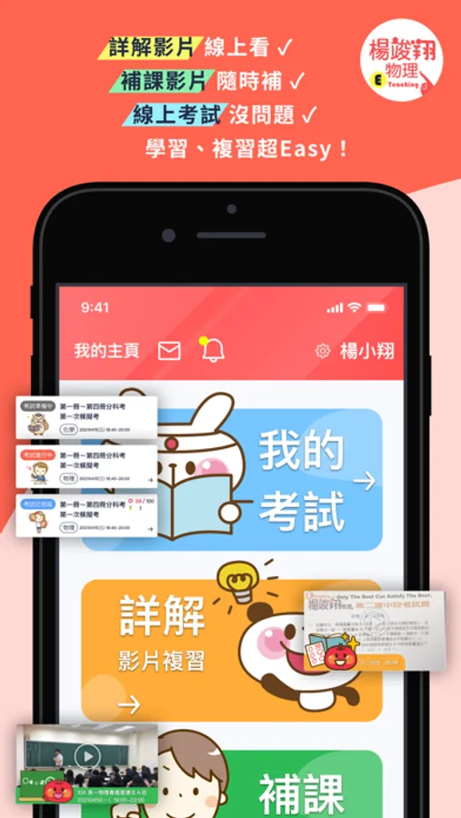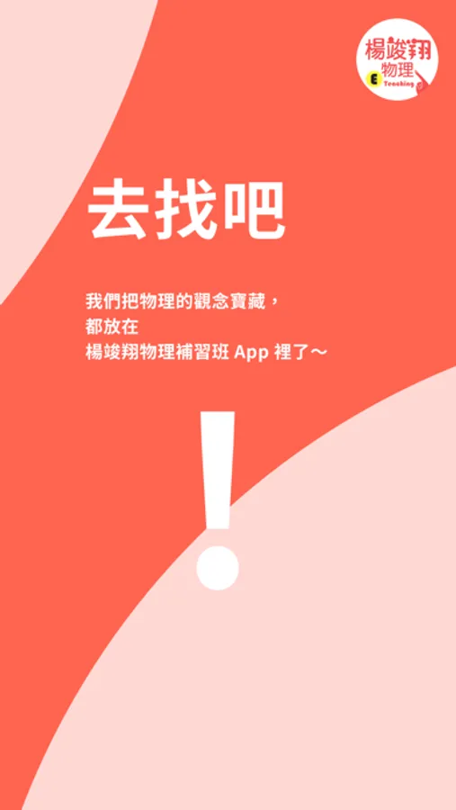 楊竣翔物理補習班 App 致力於協助每位同學能夠透過數位化的新型學習方式,透過老師的課堂教課,搭配 App 上的即時練習,輕鬆應對大小「試」。