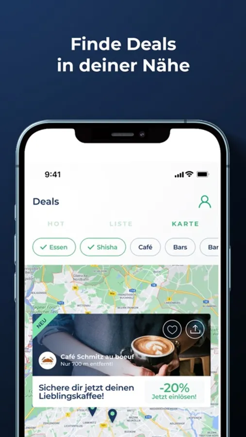 Durchsuche die Karte um Geschäfte in deiner Nähe zu finden, bei denen du gerade einen Deal einlösen kannst. Sichere dir einzigartige Angebote bei lokalen Restaurants, Bars, Bäcker, Cafés Friseuren, Kosmetikstudios und vielen mehr. Löse den Deal direkt beim Besuch im Geschäft ein und profitiere von Rabatten oder kostenlosen Goodies. Mit der Cashtag App findest du garantiert den besten Deal in deiner Nähe.